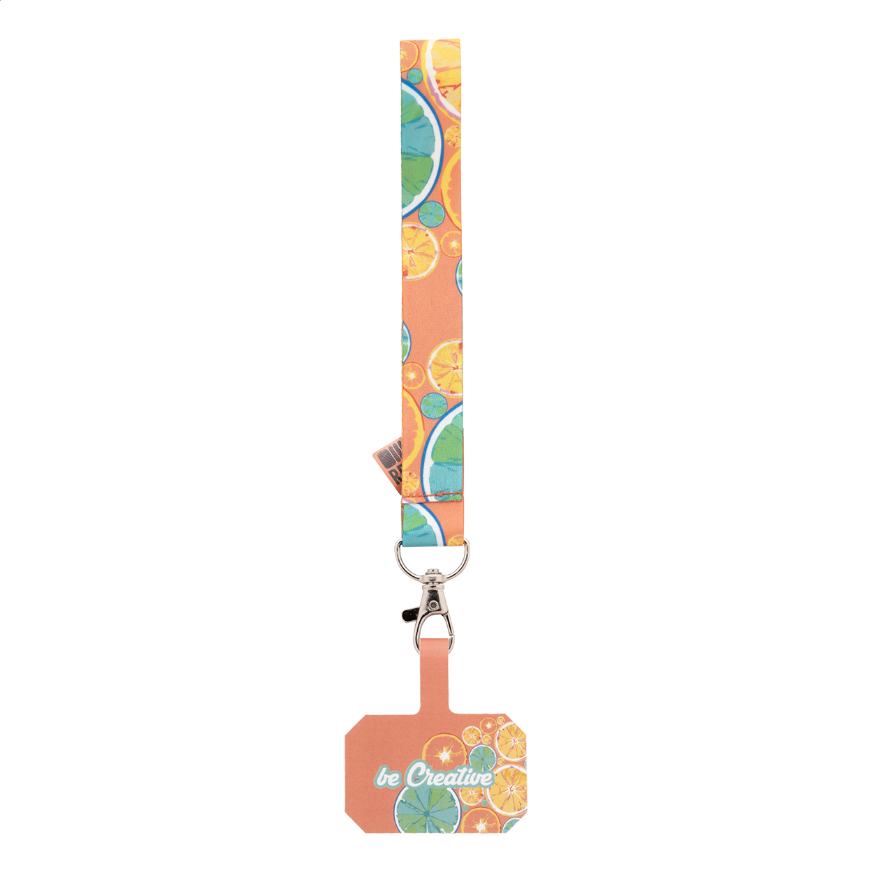 Egyediesíhető, RPET mobiltartós csuklópánt fém karabinerrel és full colour emblémázható telefontartóval, szakadásmentes papírból. Mindkét oldalán szublimációs emblémázással. Minimális rendelési mennyiség: 100 db.