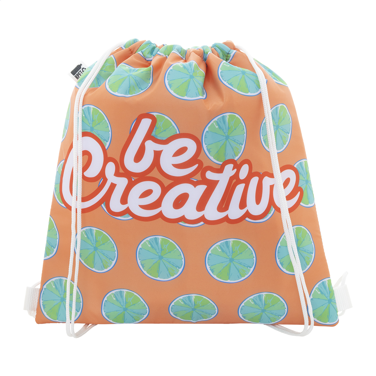 Egyedi gyártású, húzózsinóros hűtőtáska 600D RPET poliészterből, alumínium béléssel. Teljesen szublimációs nyomtatott grafikával és megkülönböztető RPET címkével. Minimális rendelési mennyiség: 25 db.