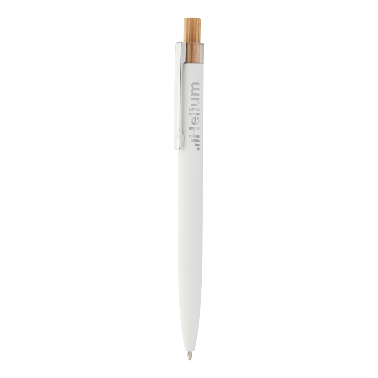 Újrahasznosított alumínium golyóstoll gumírozott felülettel, bambusz gombbal és króm klipsszel. Speciális bevonattal rendelkezik, amely különlegesen fényessé teszi a gravírozott emblémát. Kék tollbetéttel szállítjuk.