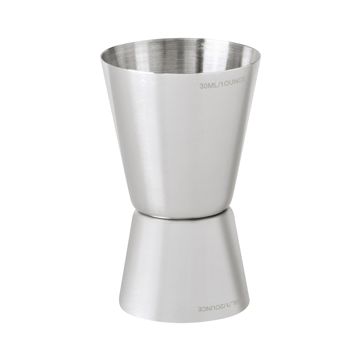 Rozsdamentes acélból készült mérce pohár, 30 ml/15 ml űrtartalommal.