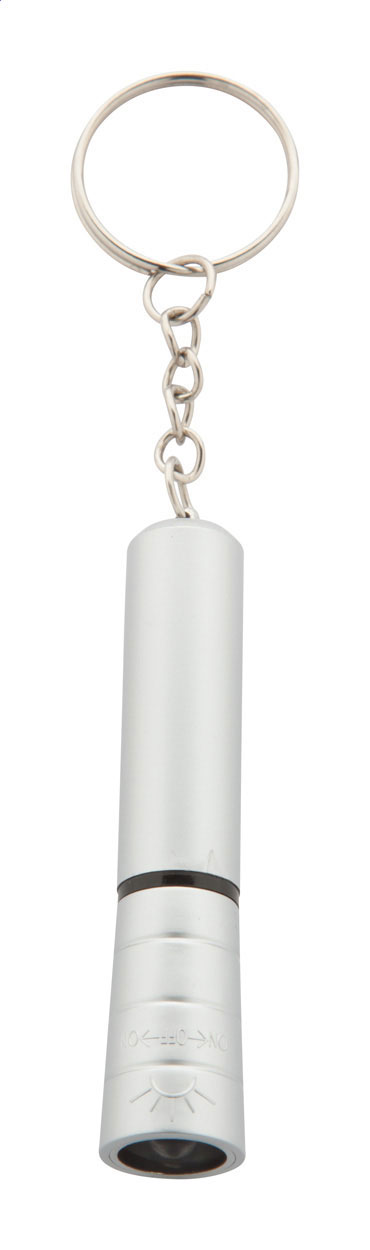 Műanyag, mini zseblámpa LED fénnyel, fémes felülettel és fém kulcstartóval. Gombelemmel szállítjuk.