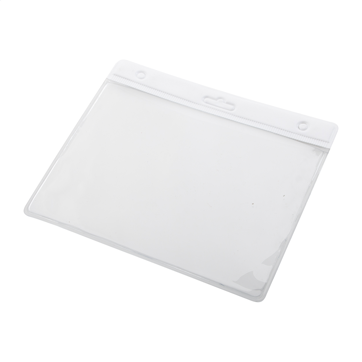 Átlátszó PVC anyagból készült kártyatartó színes sávval, nyakpántra akasztható.