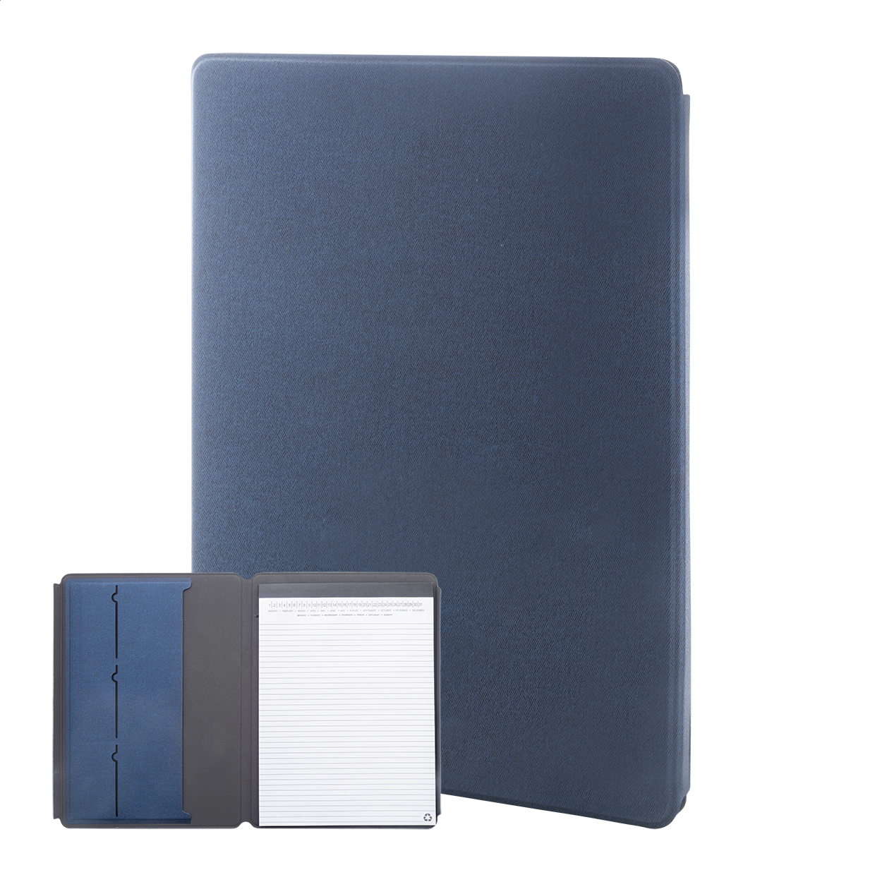 A4-es méretű, újrahasznosított PU bőr iratmappa belső rendezőzsebekkel és mágneses zárással. 20 vonalas lapos jegyzettömbbel újrahasznosított papírból.