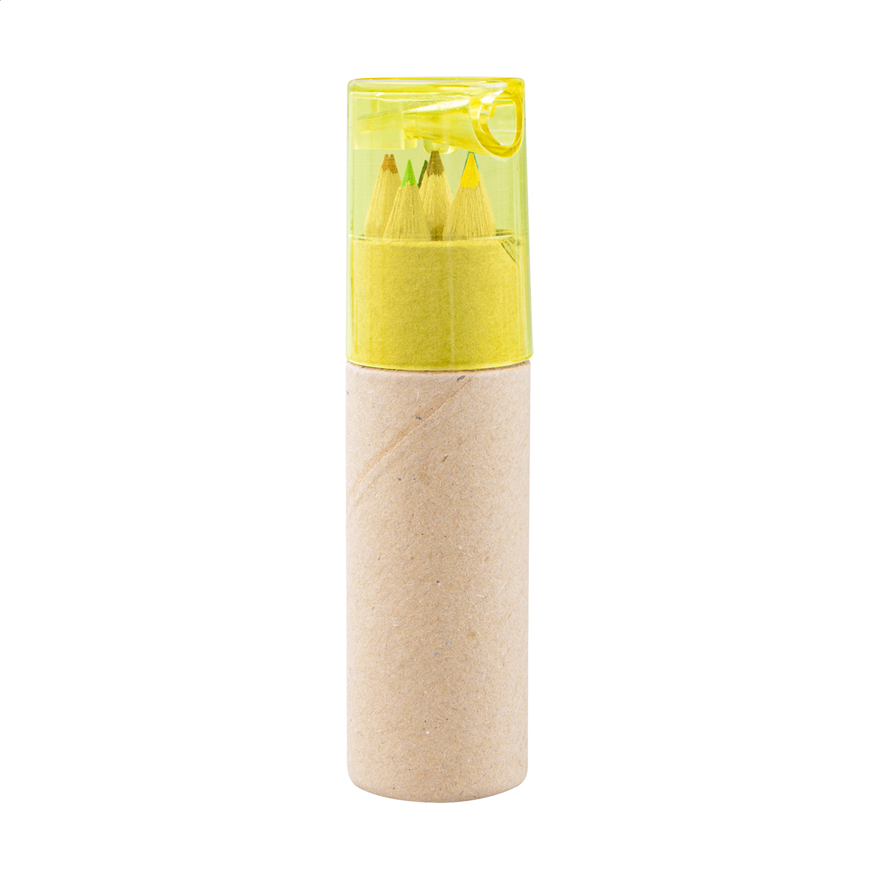 6 db-os rövid, színes ceruza, karton henger tokban, színes műanyag kupakkal, a kupak tetején hegyezővel.