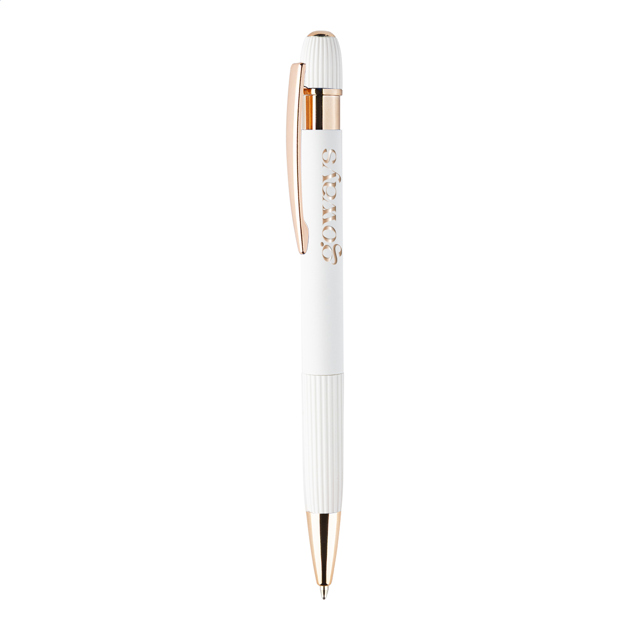 Újrahasznosított alumínium golyóstoll gumírozott testtel és rózsaarany részletekkel. Speciális bevonattal a tükörlézeres gravírozáshoz rózsaarany színben. Kék tollbetéttel.