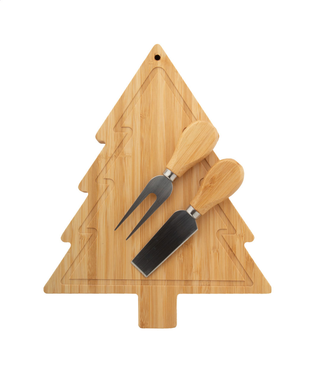 Karácsonyi bambusz sajtkés szett, karácsonyfa alakú vágódeszkával és 2 darab rozsdamentes acél sajtkéssel. Kraft papír dobozban szállítjuk.