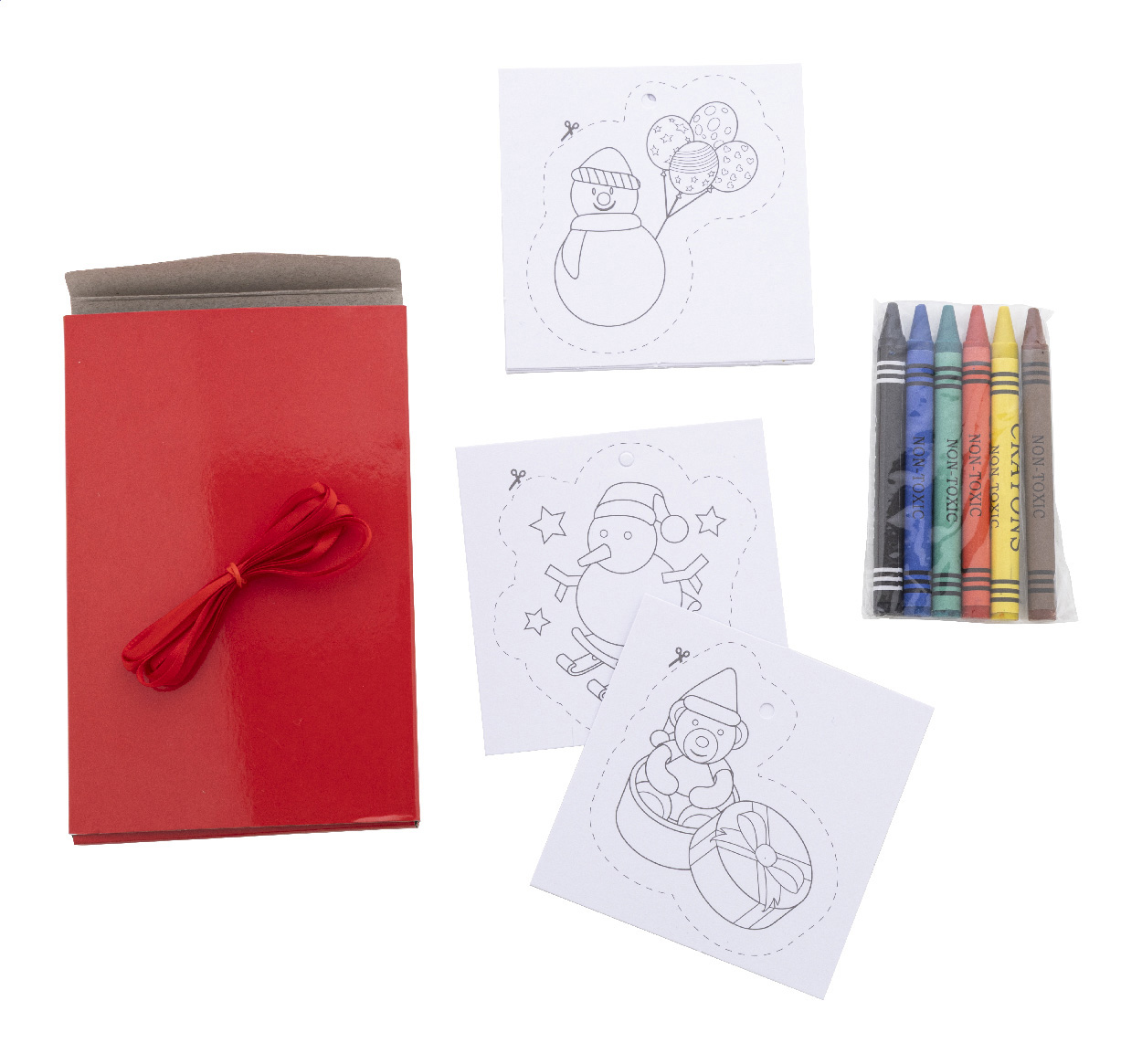 8 darabos karácsonyi színező szett papír karácsonyfadísz kártyákkal, 6 zsírkrétával és akasztós szalagokkal. Piros papírdobozban.