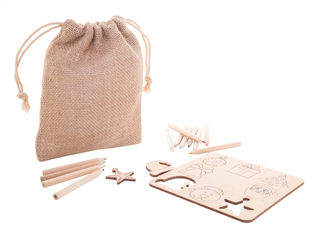 Karácsonyi színezős formakereső játék rétegelt nyírfából, juta tasakban. Tematikus kivágott figurákat (8 db) és fa színes ceruzákat (12 db) tartamaz, papírdobozban.