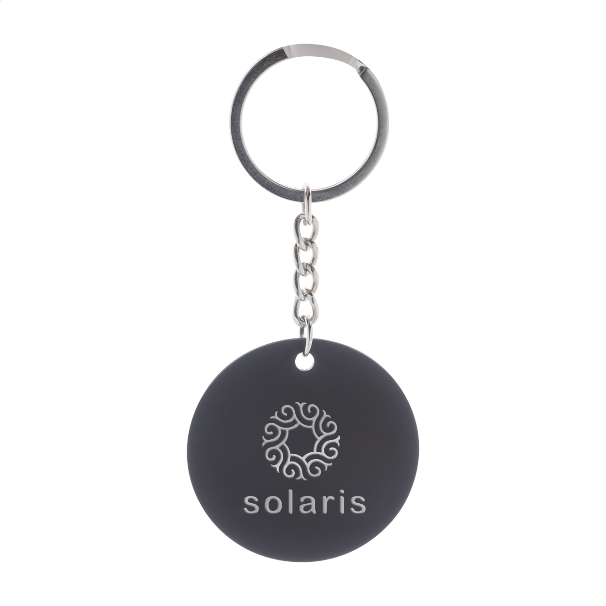 Kerek alakú, újrahasznosított rozsdamentes acél kulcstartó gumírozott felülettel. Speciális bevonattal tükögravírozáshoz.
