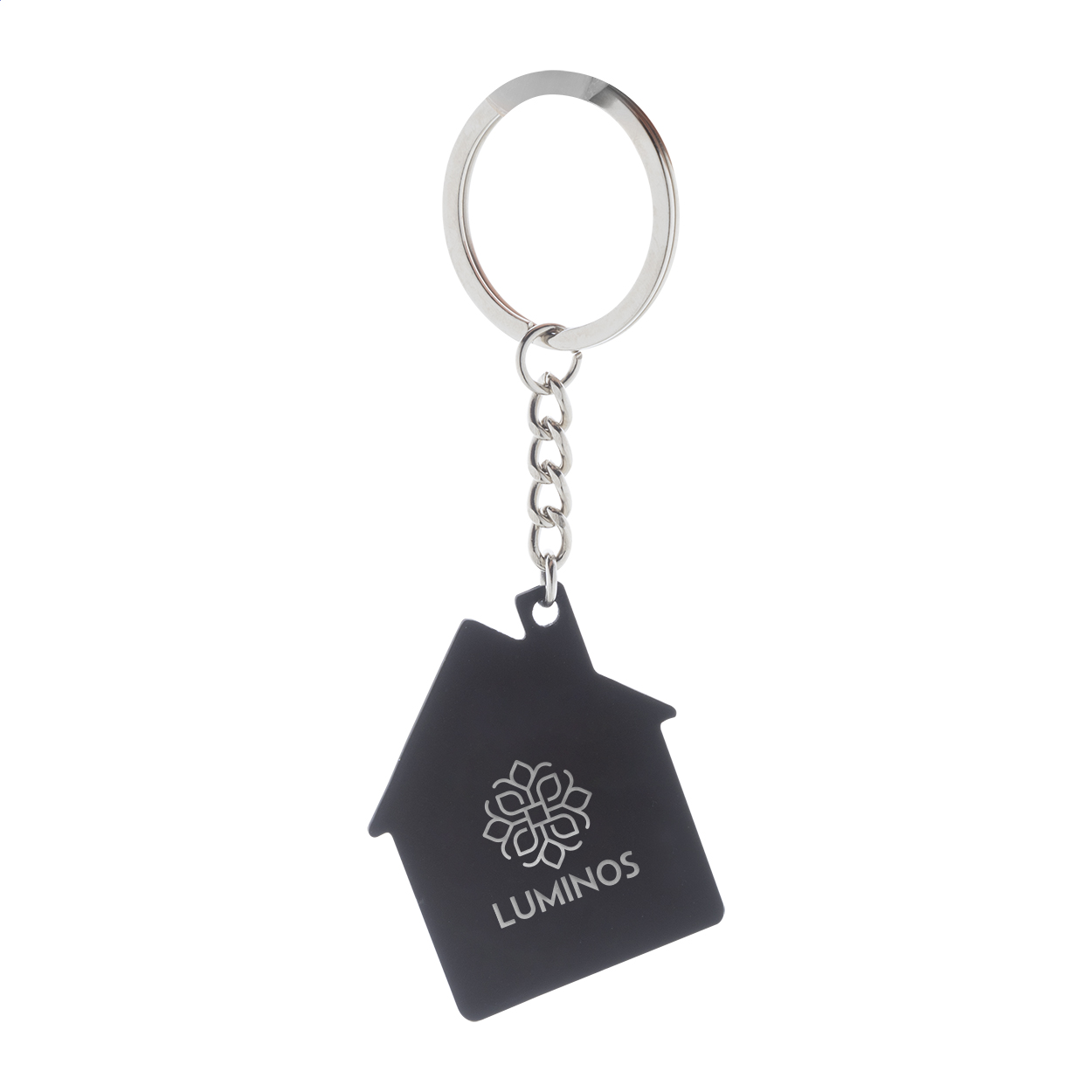 Ház alakú, újrahasznosított rozsdamentes acél kulcstartó gumírozott felülettel. Speciális bevonattal tükögravírozáshoz.