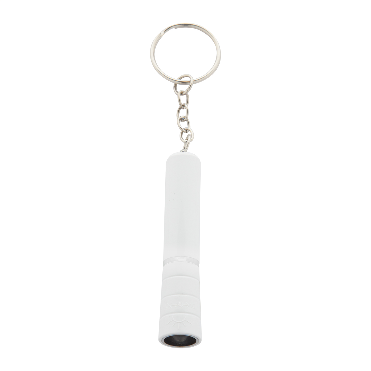 Műanyag, mini zseblámpa LED fénnyel és fém kulcstartóval. Gombelemmel szállítjuk.