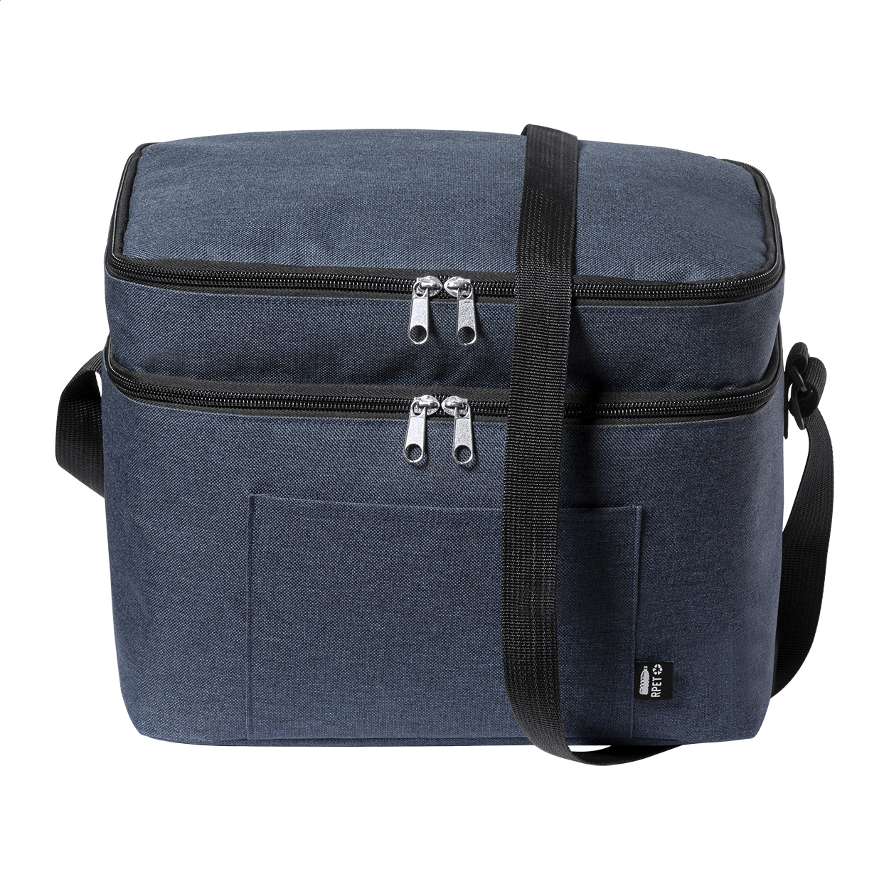 600D RPET polészterből készült hűtőtáska PEVA béléssel, 2 rekesszel és állítható vállpánttal. Megkülönböztető RPET címkével ellátva.