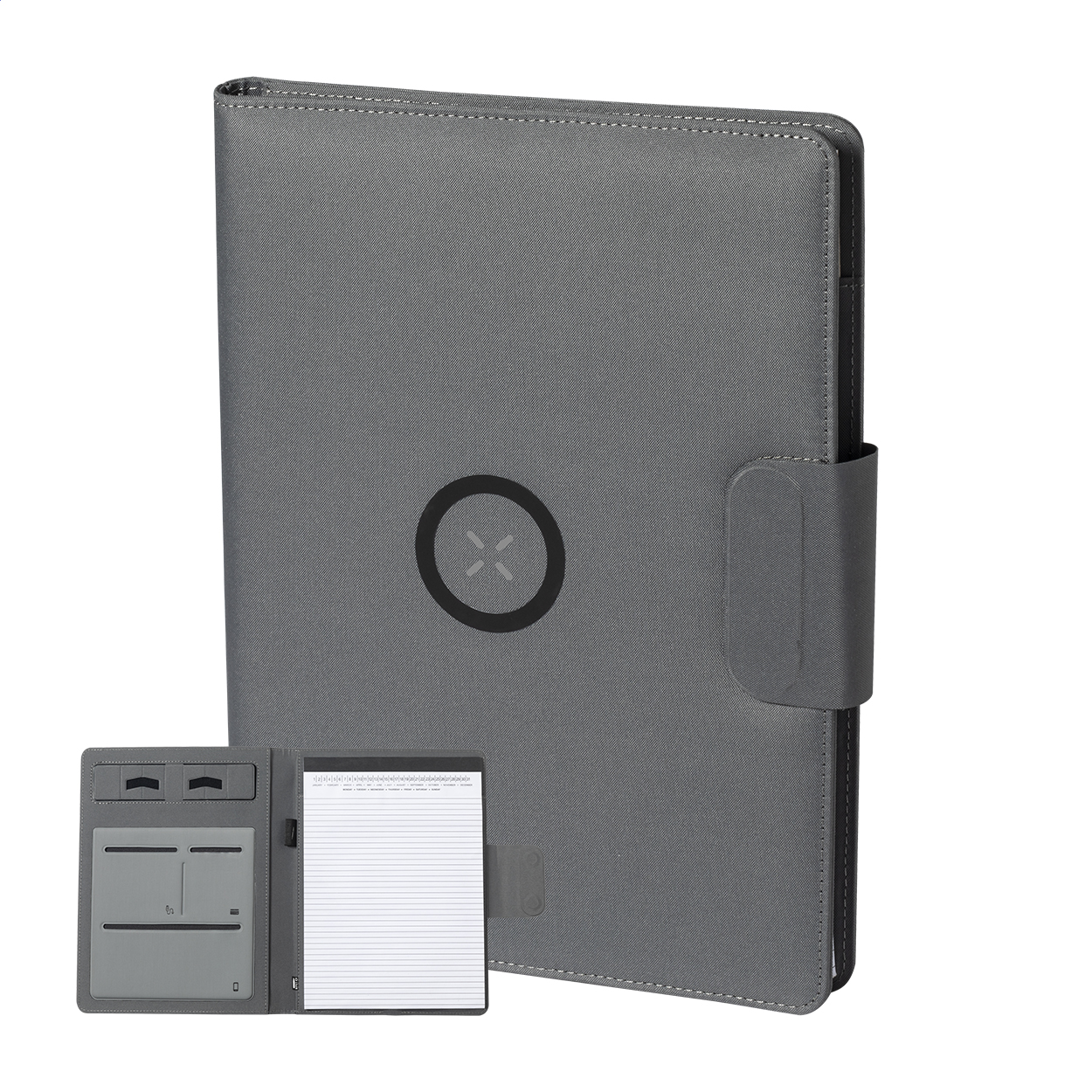 A4 méretű, 300D RPET poliészterből készült iratmappa. Beépített, mágneses vezeték nélküli töltővel (10W), 5000 mAh akkumulátorú power bank-kal és USB bemenettel ellátva. Egy összehajtható mobiltelefon-tartót és 20 vonalas lapot tartalmaz. Öntapadós fémgyűrűvel, ami minden vezeték nélküli töltővel ellátott eszközzel használható. USB töltőkábellel szállítjuk.