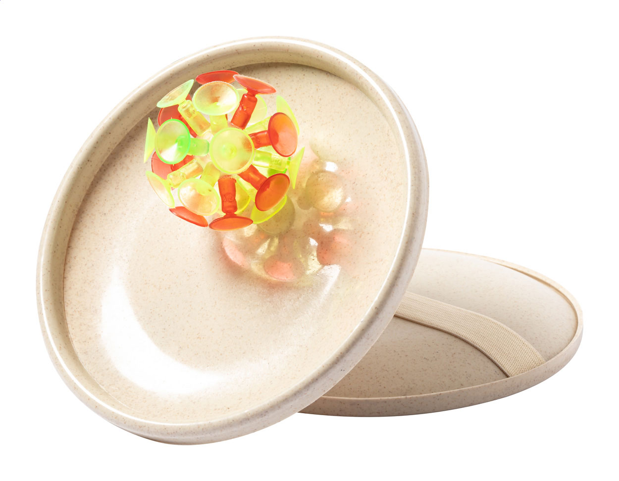 Strandjáték tapatókorongos labdákkal és búzaszalma műanyag elkapóval, rugalmas pánttal.