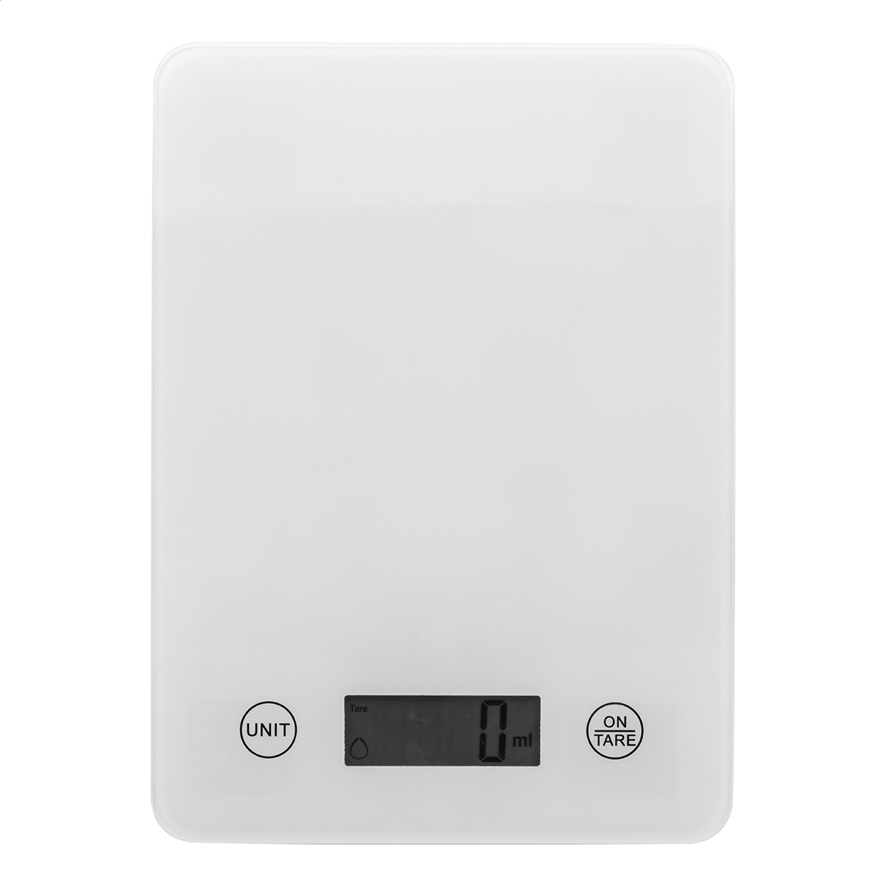 Digitális konyhai mérleg edzett üveg mérőfelülettel és beépített USB újratölthető akkumulátorral (200 mAh). Méréshatár 5 kg-ig. Mérési pontosság: 1 g. Választható mérési egységek: kg/g/oz. Tej és víz mérési funkcióval (ml). USB töltőkábellel.